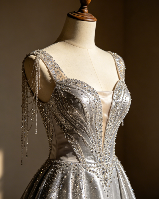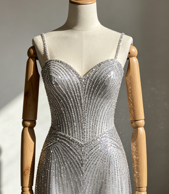 Sequins are sparsely distributed to avoid excessive visual noise, producing a refined micro-light effect. The dress responds to motion with rhythmic shimmer rather than constant reflection, creating controlled brilliance.